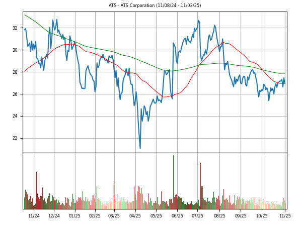 The stock is underperforming the market over the last 50 trading days when compared to the S&P 500. The MACD-LT, an intermediate-term trend indicator, is bullish at this time. A close above $27.62 is a number to watch to confirm a trend reversal.Momentum as measured by the 14-day RSI is positive but showing signs of slowing. Over the last 50 trading sessions, there has been more volume on up days than on down days, indicating that ATS is under accumulation, which is a bullish condition. The stock is trading above a rising 50-day moving average which confirms the improving technical condition. A move in price above the 200-day moving average will add to the improving technical condition of ATS.