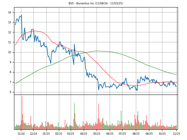 The stock is underperforming the market when compared to the S&P 500 over the last 50 trading days. Though the technical condition of BVS is deteriorating, MACD-LT, an intermediate-term trend indicator, remains bullish at this time. BVS's chart formation is showing signs of reversing its recent trend. If the stock closes below $6.52 a change in trend will be confirmed.Upside momentum, as measured by the 14-day RSI, is negative. The stock is in a short-term oversold condition based on a Slow % K stochastic reading of 20 or lower. Over the last 50 trading sessions, there has been more volume on down days than on up days, indicating that BVS is under distribution, which is a bearish condition. The stock is trading below a falling 50-day moving average which confirms the deteriorating technical condition of BVS. In addition, BVS is below its declining 200-day moving average.