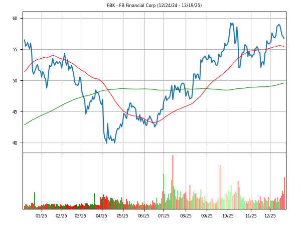 The stock is underperforming the market when compared to the S&P 500 over the last 50 trading days. While the technical condition of FBK is deteriorating there remain positive factors which include the MACD-LT, an intermediate-term trend indicator, which is bullish at this time. FBK's chart formation is showing signs of reversing its recent trend. If the stock closes below $54.98 a change in trend will be confirmed.Upside momentum, as measured by the 14-day RSI, is positive but beginning to weaken. Over the last 50 trading sessions, there has been more volume on down days than on up days, indicating that FBK is under distribution, which is a bearish condition. The stock is currently above a falling 50-day moving average. A move below this average would be confirmation that the trend is changing. FBK could find secondary support at its rising 200-day moving average.