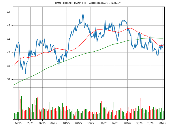 The stock is outperforming the market when compared to the S&P 500 over the last 50 trading days. The MACD-LT, is confirming that the intermediate-term trend is bullish at this time. A close above $44.07 is a number to watch to confirm a trend reversal.Momentum as measured by the 14-day RSI is gaining in strength. Over the last 50 trading sessions, there has been more volume on up days than on down days, indicating that HMN is under accumulation, which is a bullish condition. The stock is trading above a rising 50-day moving average which confirms the improving technical condition. A move in price above the 200-day moving average will add to the improving technical condition of HMN.