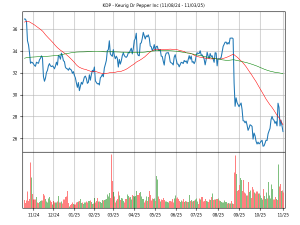 The stock is underperforming the market over the last 50 trading days when compared to the S&P 500. The MACD-LT, an intermediate-term trend indicator, is bullish at this time. A close above $27.25 is a number to watch to confirm a trend reversal.The stock is in a short-term oversold condition based on a Slow % K stochastic reading of 20 or lower. Over the last 50 trading sessions, there has been more volume on up days than on down days, indicating that KDP is under accumulation, which is a bullish condition. The stock is trading below a falling 50-day moving average. A close above this moving average would be supportive of the improving conditions.