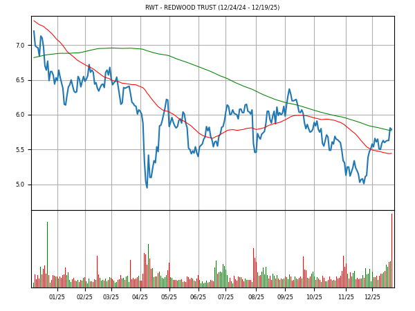 Over the last 50 trading days, when compared to the S&P 500, the stock has performed in line with the market. The MACD-LT, is confirming that the intermediate-term trend is bullish at this time. RWT's chart formation suggests an upward trend is beginning. stock is in the early stages of a rising trend. A close above $5.88 is a number to watch to confirm a trend reversal.Momentum as measured by the 14-day RSI is gaining in strength. Over the last 50 trading sessions, there has been more volume on up days than on down days, indicating that RWT is under accumulation, which is a bullish condition. The stock is trading above a rising 50-day moving average which confirms the improving technical condition. The stock is above a falling 200-day moving average which adds credence to a possible trend reversal.