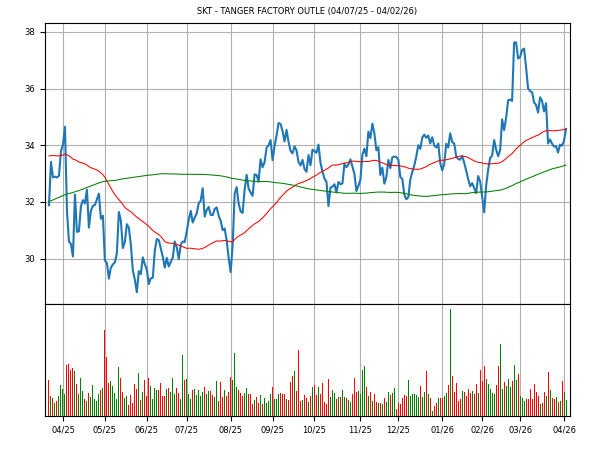 The stock has outperformed the market over the last 50 trading days when compared to the S&P 500. The MACD-LT, an intermediate-term trend indicator, is bearish at this time. SKT's chart formation is showing signs of reversing its recent trend. If the stock closes below $34.24 a change in trend will be confirmed.Over the last 50 trading sessions, there has been more volume on down days than on up days, indicating that SKT is under distribution, which is a bearish condition. The stock is trading above a rising 50-day moving average. If SKT falls below this important support level it could trigger additional selling pressure. SKT could find secondary support at its rising 200-day moving average.
