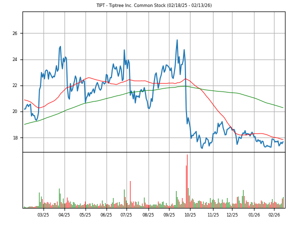 The stock is underperforming the market when compared to the S&P 500 over the last 50 trading days. While the technical condition of TIPT is deteriorating there remain positive factors which include the MACD-LT, an intermediate-term trend indicator, which is bullish at this time. TIPT's chart formation is showing signs of reversing its recent trend. If the stock closes below $17.46 a change in trend will be confirmed.Upside momentum, as measured by the 14-day RSI indicator, remains positive. Over the last 50 trading sessions, there has been more volume on down days than on up days, indicating that TIPT is under distribution, which is a bearish condition. The stock is trading below a falling 50-day moving average which confirms the deteriorating technical condition of TIPT. In addition, TIPT is below its declining 200-day moving average.