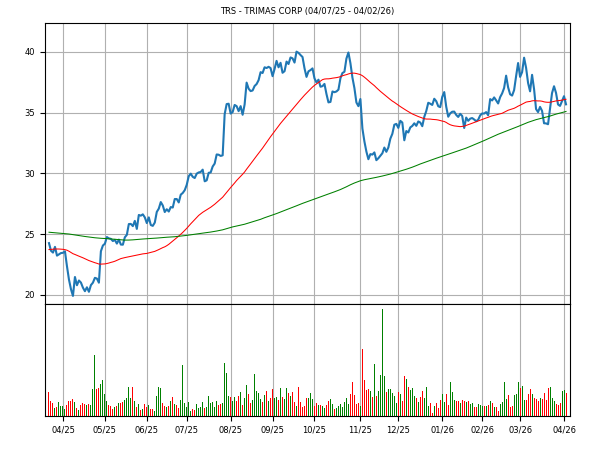 The stock has outperformed the market over the last 50 trading days when compared to the S&P 500. The MACD-LT is indicating that the intermediate-term trend is bearish at this time. If the stock closes below $35.11 a change in trend will be confirmed.Over the last 50 trading sessions, there has been more volume on down days than on up days, indicating that TRS is under distribution, which is a bearish condition. The 50-day moving average is pointed up but the stock is trading below this important support level which is bearish. TRS could find secondary support at its rising 200-day moving average.