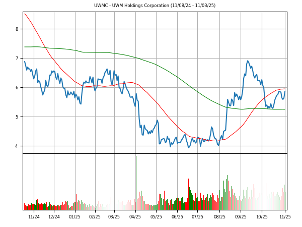 The stock is underperforming the market when compared to the S&P 500 over the last 50 trading days. The MACD-LT, an intermediate-term trend indicator, is bearish at this time. If the stock closes below $5.55 a change in trend will be confirmed.Upside momentum, as measured by the 14-day RSI, is negative. Over the last 50 trading sessions, there has been more volume on down days than on up days, indicating that UWMC is under distribution, which is a bearish condition. The 50-day moving average is pointed up but the stock is trading below this important support level which is bearish. UWMC is holding above a declining 200-day moving average.